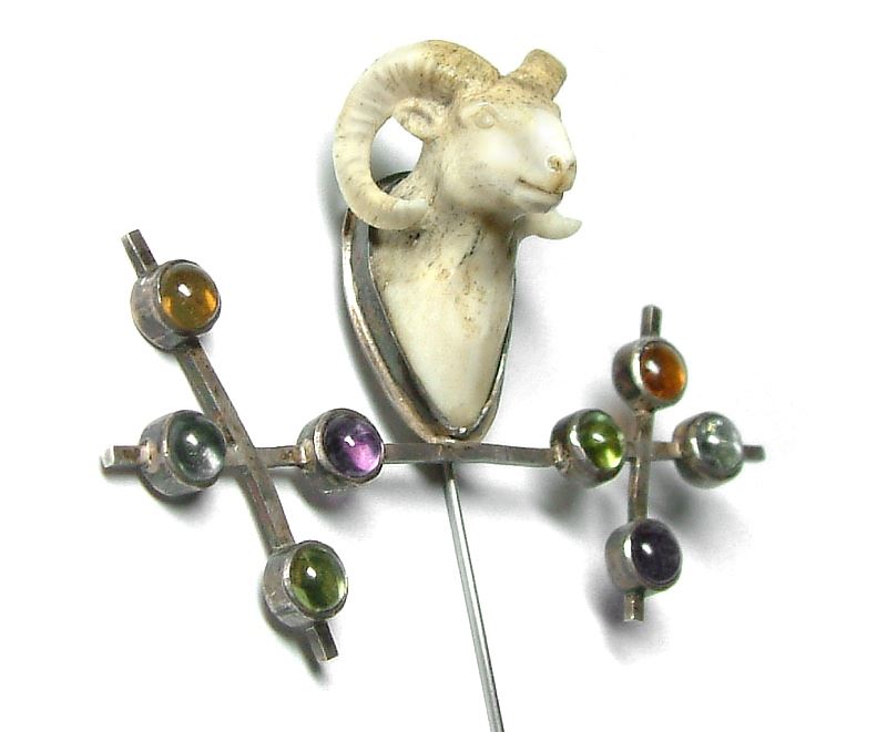 • Designer Anstecknadel, Mufflon aus Bein, Turmaline