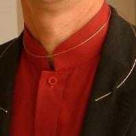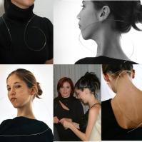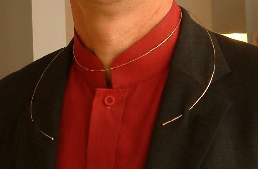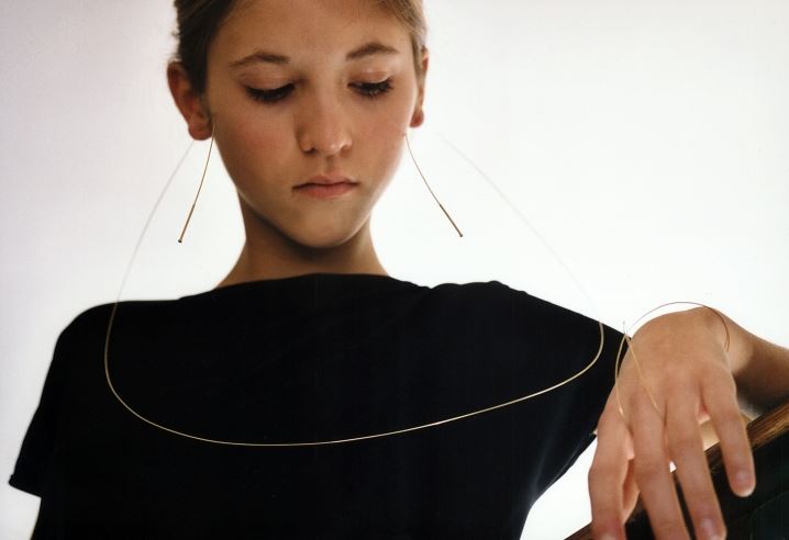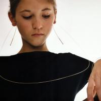 Der lange flexible Golddraht kann wahlweise nur als Halsschmuck, als Hals- und Ohrschmuck oder als Halsschmuck, Ohrschmuck und Brosche getragen werden. Der Finger- und Armschmuck wird wie ein Handschuh über einen Finger und das Handgelenk gezogen. Der/die Träger(in) hat eine unendliche Vielfalt an Kombinationsmöglichkeiten.